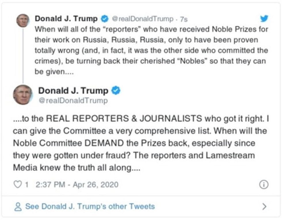 OK, so Sunday afternoon, President Speak & Spell went on this stupid long-ass rant about the "Noble Committee," because he was upset about "reporters" getting "Noble Prizes" for "their work on Russia, Russia, Russia, only to have been proven totally wrong (and, in fact, it was the other side who committed the crimes)." (Aside from a story here and there, the reporters did not get it wrong, and the "other side" did not commit the crimes, President I-Would-Like-You-To-Do-Us-A-Favor-Though. ) He wants "Nobles" given to "REAL REPORTERS & JOURNALISTS who got it right," and offered to send the "Noble Committee" a list. He wanted to know when the "Noble Committee" would "DEMAND the Prizes back," since they were "gotten under fraud."