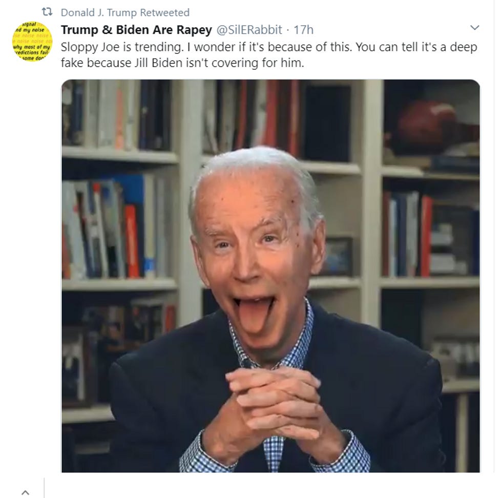 He retweeted this unclever deepfake of Joe Biden, from a Twitter user who appears to have changed their display name to "Trump and Biden are rapey." At press time, the retweet is still there.