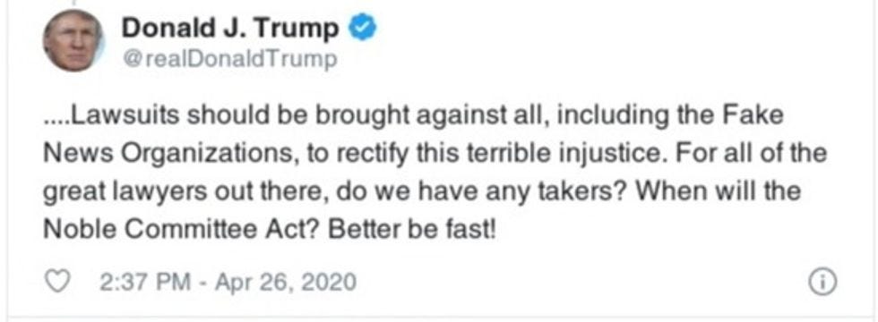"When will the Noble Committee act? Better be fast!" concluded Trump.