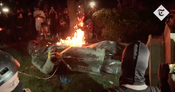 Delegate Eleanor Holmes Norton, a non-voting member of the House of Representatives, tried to have Pike's statue removed last year on account of all the racism and treason. Demonstrators took matters into their own hands Friday. They wrapped two ropes around the statues, yanked it down, and set it on fire. Police officers stood and watched, as if a fellow cop was killing a black man in front of them.