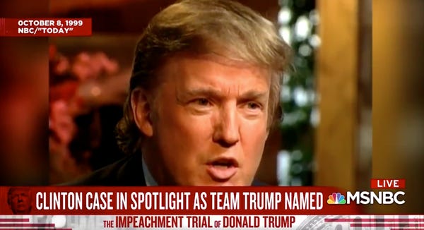 We're not sure what Dershowitz means by a "dangerous constitutional precedent." Is he worried that impeachment will become some nakedly partisan exercise, with one side fully removed from any fact or evidence more significant than the accused president's political party? Would we see players committed to Bill Clinton's political destruction openly switch sides and defend Donald Trump ? He's probably overreacting.
