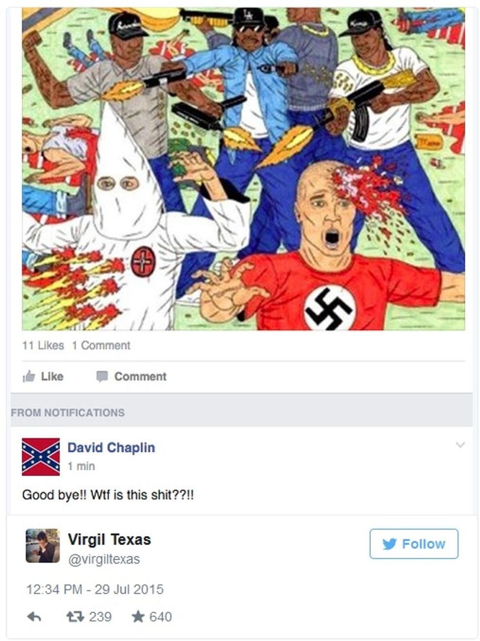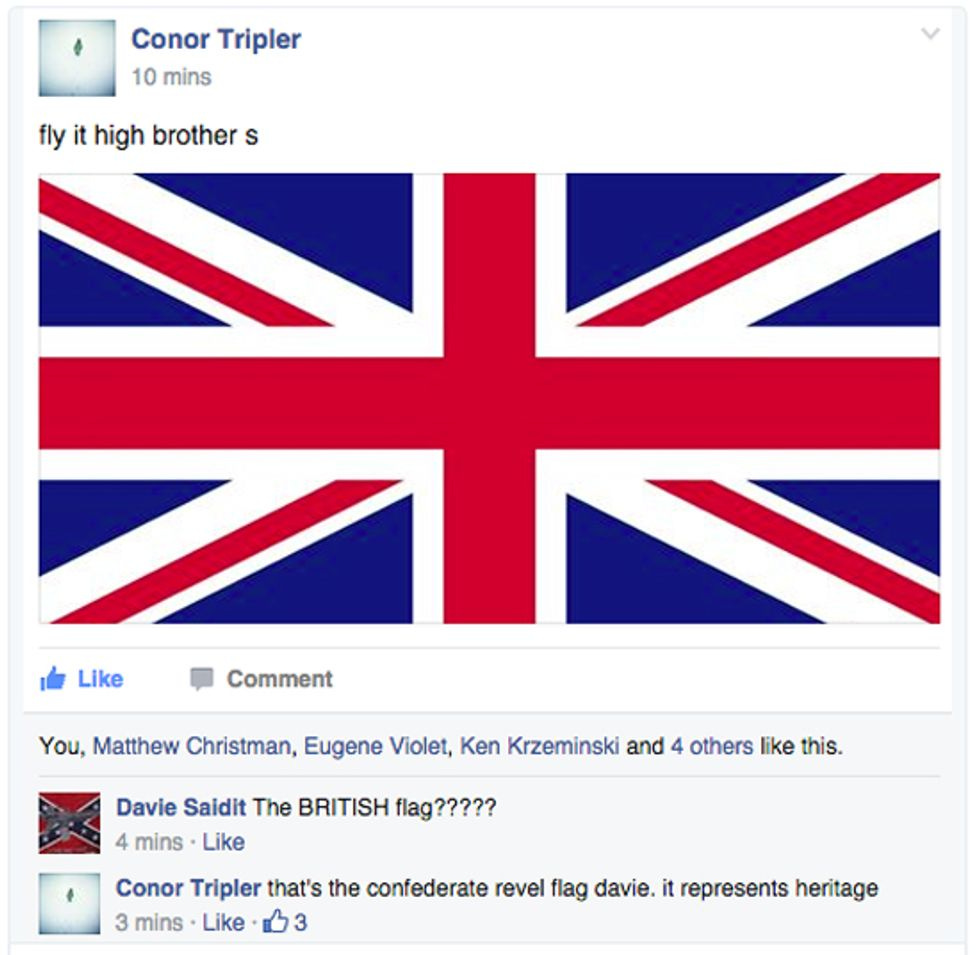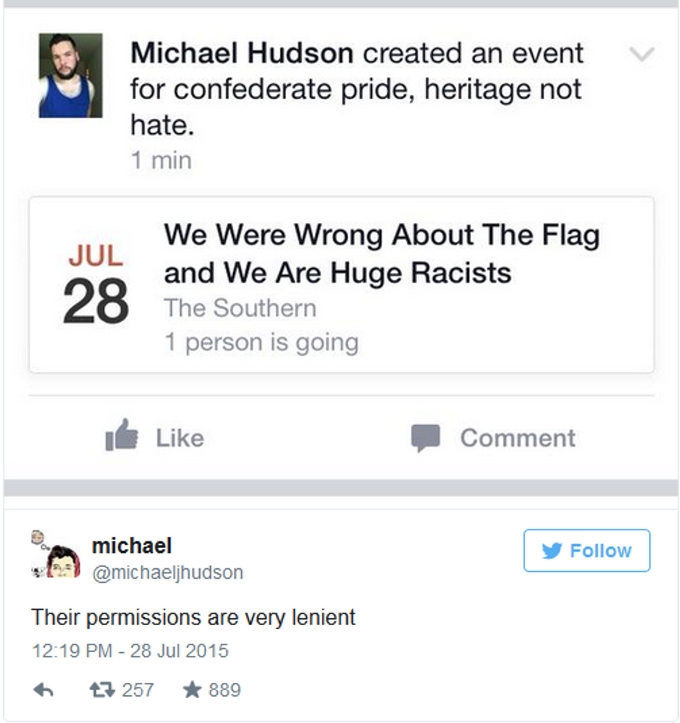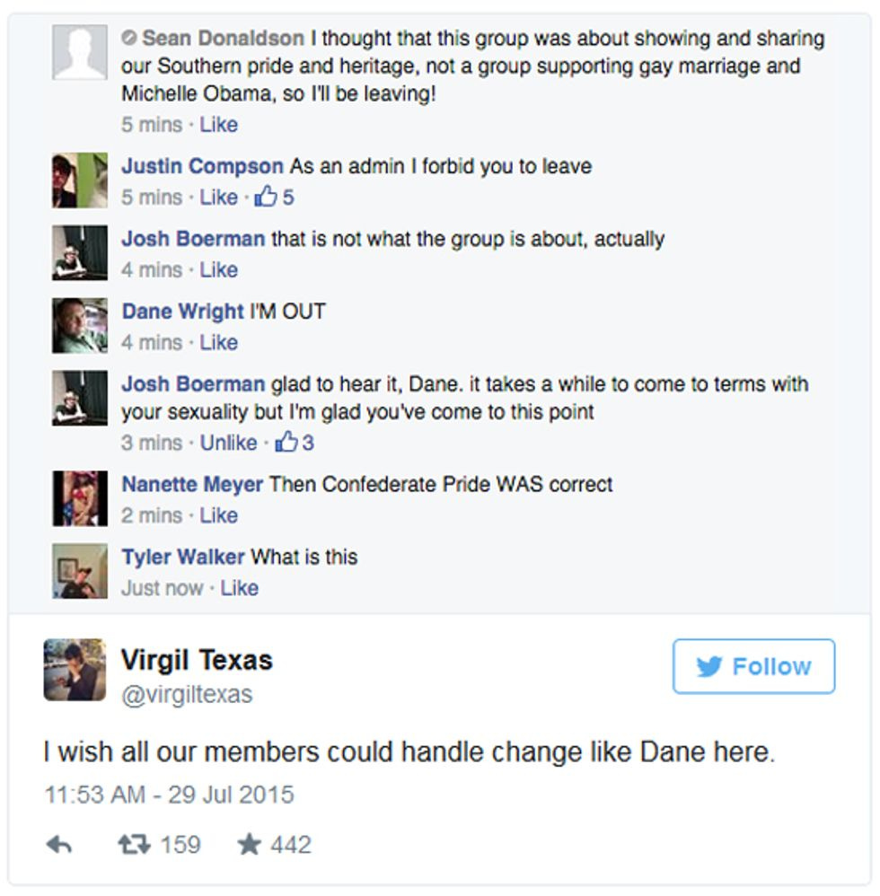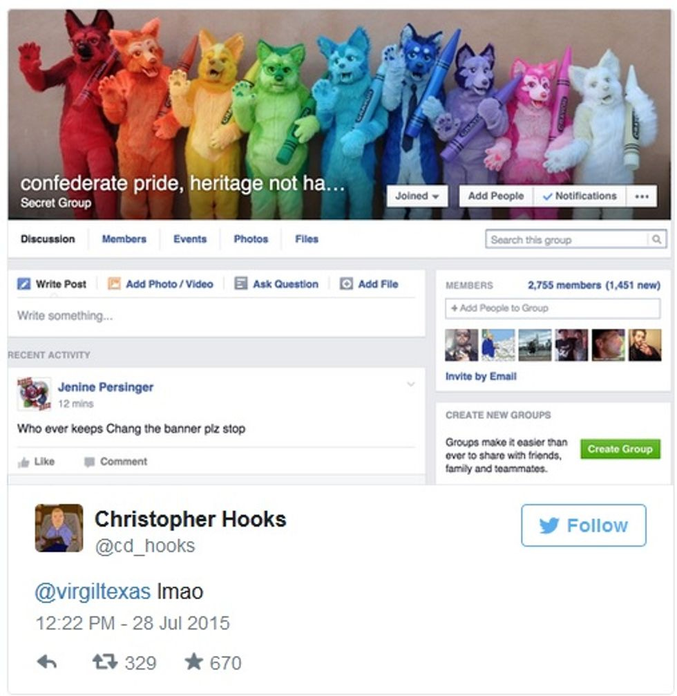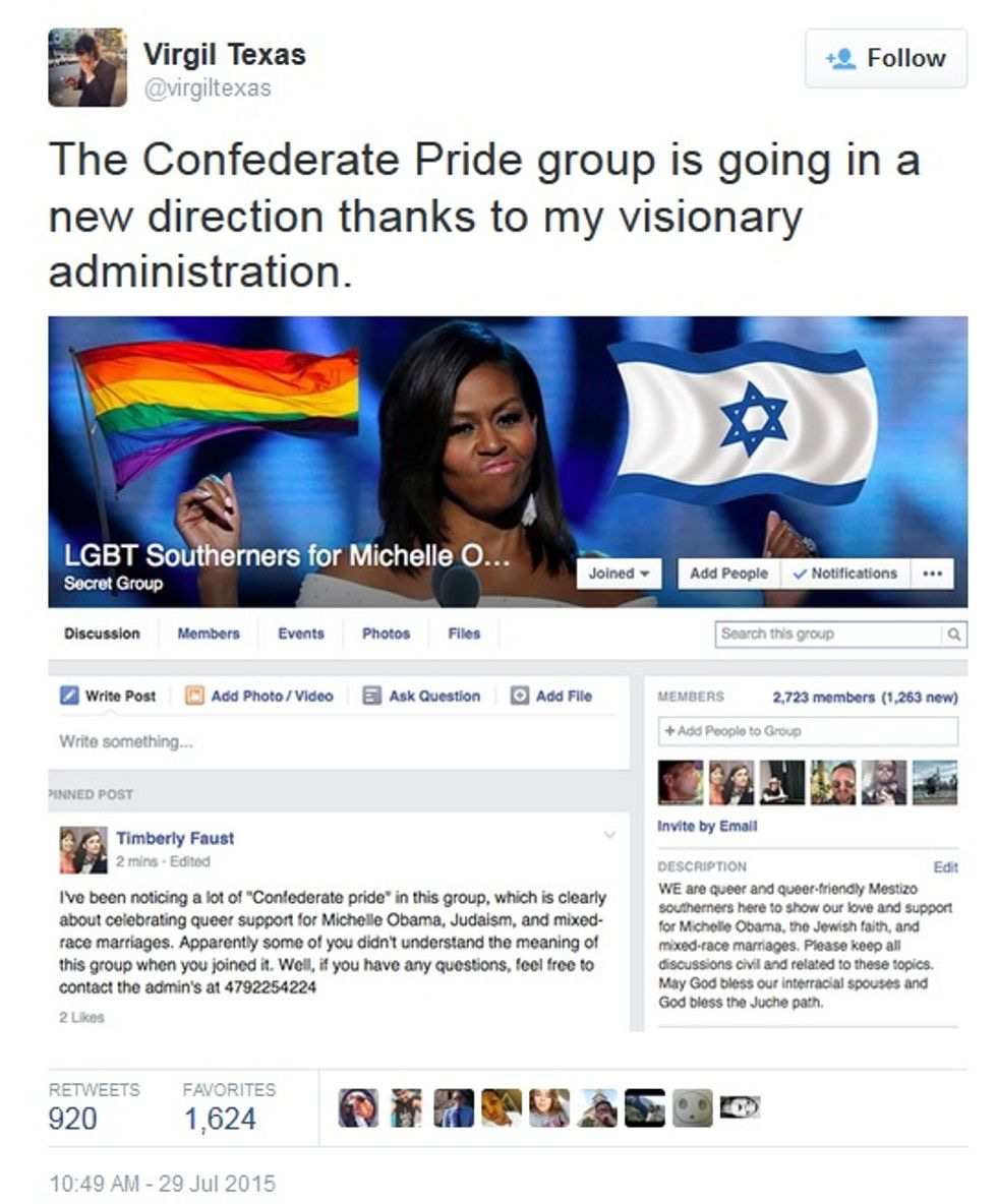 Slate identifies the merry prankster as Virgil Texas, a "Brooklyn-based professional funny person" who got himself into a "Confederate Pride" group, messed around with its header pictures, and then volunteered to help the group's administrators "clean out all the trolls" if they'd just let him have access to all the site's settings. And then the real fun started. Here's a sample of screenshots ( there are more here ):