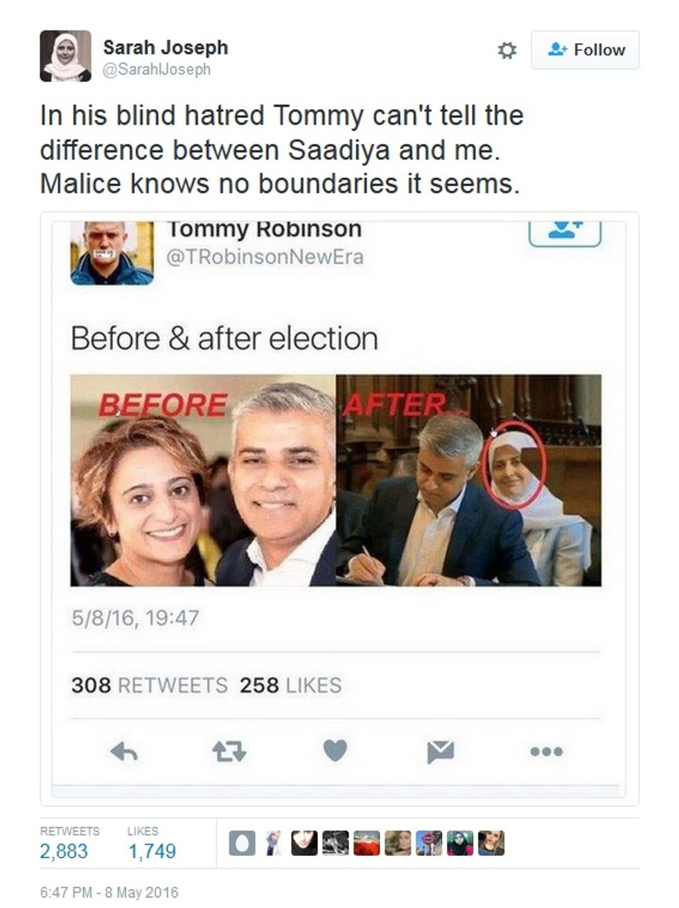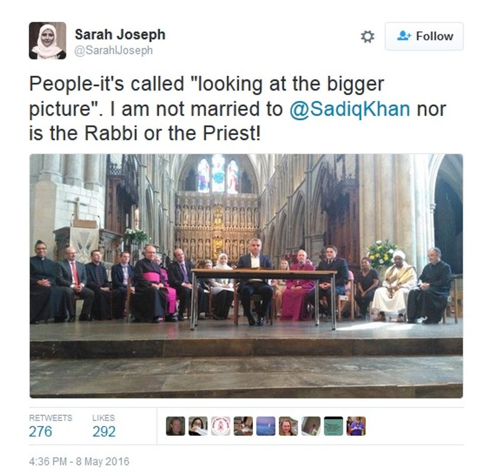 Oh, and that shocking photo of Mrs. Khan suddenly forced back into a hijab after the election? Funny thing: It's not Saadiya Khan at all. It's Sarah Joseph, a Labour Party campaigner and media CEO who converted to Islam and does wear a hijab. She wasn't amused, at first.