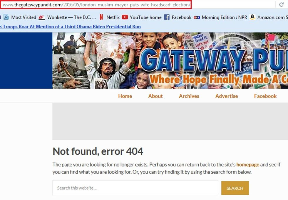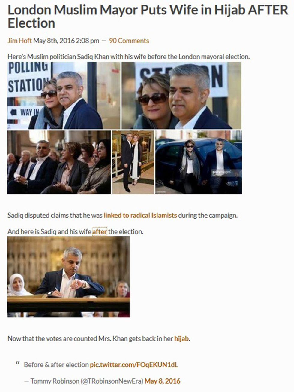 Jim Hoft, the Stupidest Man on the Internet,* has once again made an ass of himself by believing some stupid bullshit from the internet, then writing his own stupid bullshit about it. As you've probably heard, over the weekend London elected its very first Muslim mayor, Sadiq Khan, who will be barred from visiting the United States of America if Donald Trump is elected president. As Wonkette pal Charles Johnson details at Little Green Footballs, Hoft was very excited to see a Gotcha! tweet from Tommy Robinson, co-founder of the neo-fascist English Defence League, purporting to prove that the slippery Muzzie Mayor had pulled a fast one on London voters by having his wife Saadiya wear western clothes before the election, then promptly forcing her back into a hijab as soon as he was sworn in. Hoft was VERY EXCITED by this inescapable proof of Muslim duplicity: