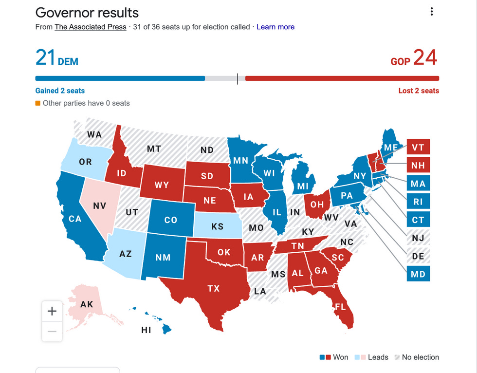 Yesterday was not a great day for Republicans trying to become governors by running on a MAGA platform. To be sure, some certified (and certifiable) rightwing, Trumpy incumbents resisted challenges by Democrats in red states. Greg Abbott will keep spreading his foul stench over Texas for another four years, as will Ron DeSantis in Florida, Kim Reynolds in Iowa, and Kristi Noem in whichever Dakota she's in. The South one, we checked. In a loss that really hurt because damn it, we really liked her, Democrat Joy Hofmeister ended up nowhere close to defeating Trumpy Kevin Stitt of Oklahoma, who will presumably find a new disease for his state's unvaccinated National Guard members to spread.