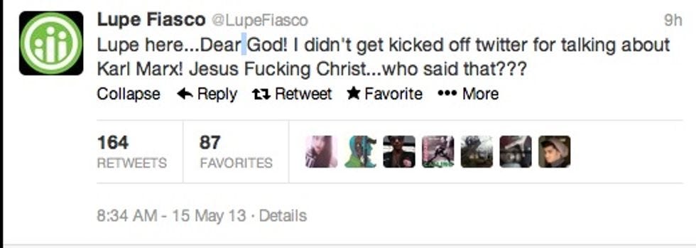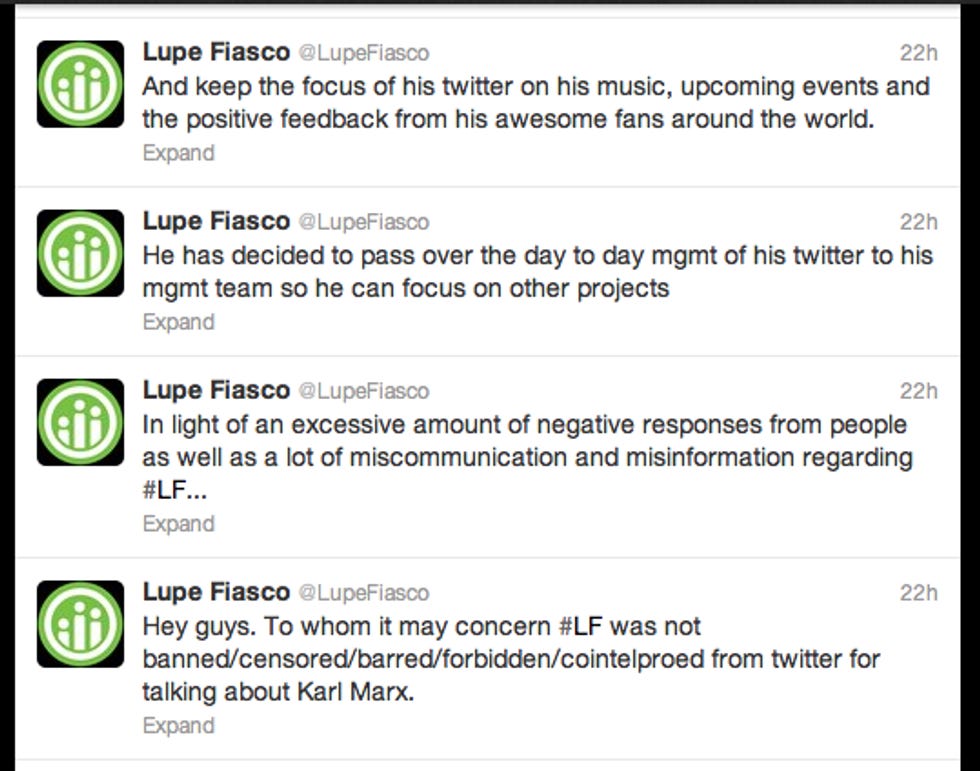 Except, you know what? All of this talk about "work," and "society," and "capital" was taking the focus off buying stuff, so his management quickly stepped in to assure fans that while Lupe Fiasco was NOT BEING CENSORED, and NOT BEING KICKED OFF TWITTER, he wouldn't be Tweeting because he accidentally "miscommunicated" that he occasionally thinks, talks, and reads about Marxism. And as every good Amercian knows, thoughts, discussions, and books can be dangerous, ESPECIALLY when they are about Marxism.