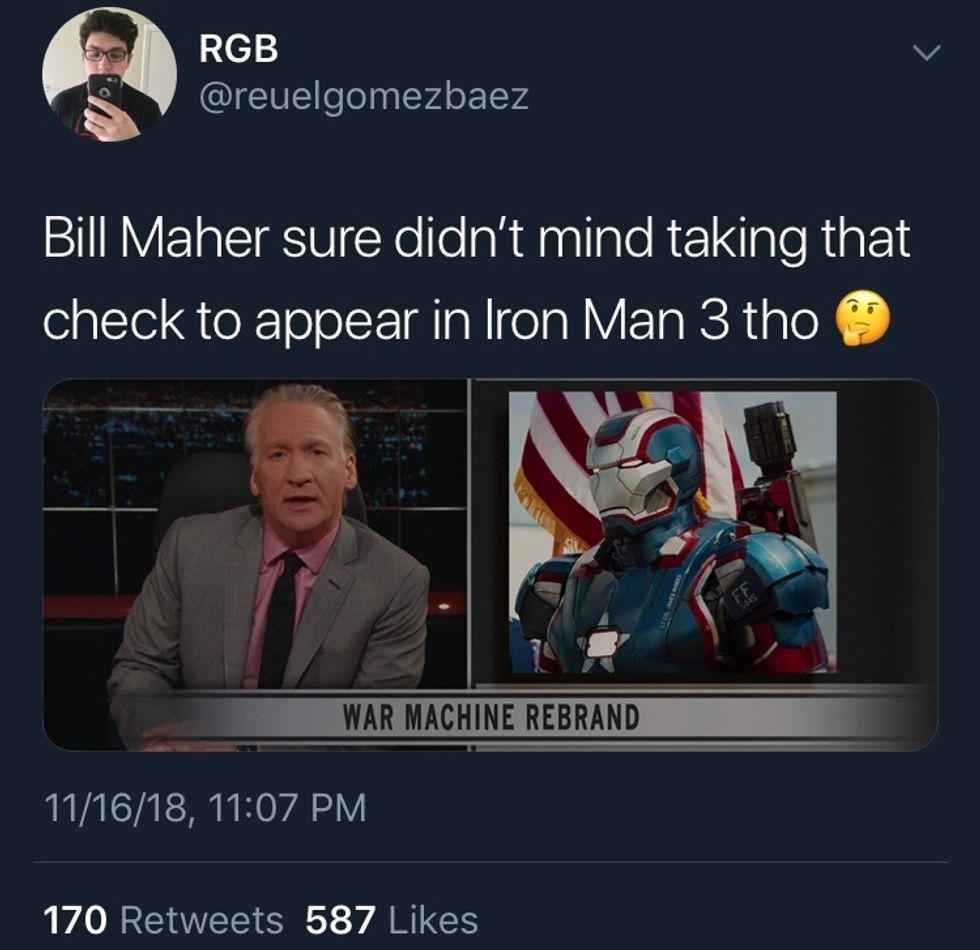This was perhaps the most enduring lesson Stan Lee ever taught. A few examples of failing at this lesson are Maher using his power (his platform) to irresponsibly elevate Milo Hanrahan (fuck him, that's his last name. I'm calling him by the name of the father he has issues with instead of his preferred grandmother's name), who Maher calls "a younger Christopher Hitchens" ONE WEEK before he resigned Breitbart following outrage over his past comments about pedophilia . ( A downfall that then Maher tried to take credit for .)