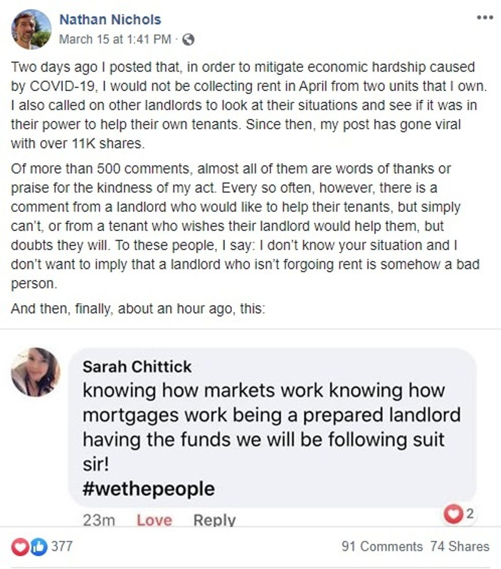Nichols pointed out that the cost of not getting a month's rent wouldn't hurt him as much as the cost of losing the tenants, and said his reason for making the post to Facebook was all about encouraging others to rethink their priorities during the coronavirus outbreak: