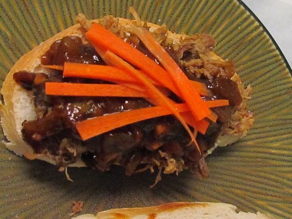 This is barbecue sauce. It's pretty tangy. Maybe you like it sweeter or more spicy. You are in control of those parameters: add more spicy ingredients to make it spicier, add more honey (or other kind of sugar) to make it sweeter, add less vinegar to make it less tangy. Use it however you like to use barbecue sauce. We pulled some smoked pork butt from the freezer for sandwiches.
