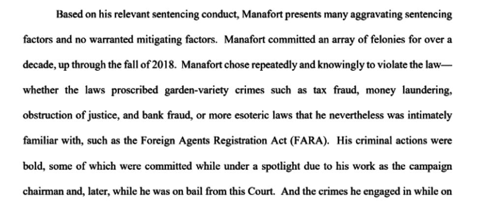 The document just keeps going like that, noting that Manafort does crimes "repeatedly and brazenly" and that even after he was indicted, his crime spree "remarkably went unabated." Donald Trump says he surrounds himself with the best people, and we guess that's true if your idea of "best" is a mobbed up foreign agent who never ever plays hooky from being a criminal. That's the kind of dedication Donald Trump appreciates!