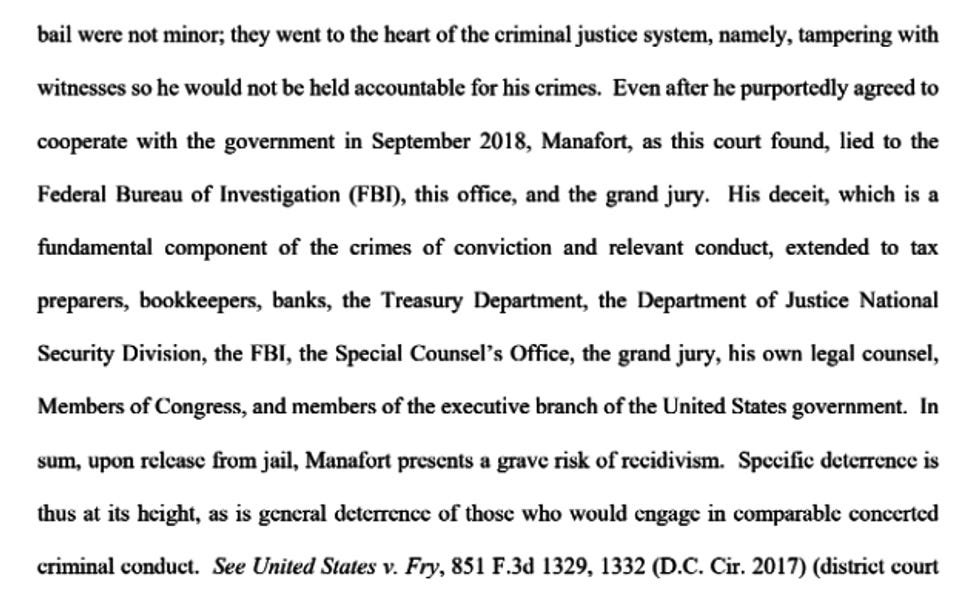 Based on his relevant sentencing conduct, Manafort presents many aggravating sentencing factors and no warranted mitigating factors. Manafort committed an array of felonies for over a decade, up through the fall of 2018. Manafort chose repeatedly and knowingly to violate the law -- whether the laws proscribed garden-variety crimes such as tax fraud, money laundering, obstruction of justice, and bank fraud, more more esoteric laws that he nevertheless was intimately familiar with, such as the Foreign Agents Registration Act (FARA). His criminal actions were bold, some of which were committed while under a spotlight due to his work as the campaign chairman and, later, while he was on bail from this Court. And the crimes he engaged in while on bail were not minor; they went to the heart of the criminal justice system, namely, tampering with witnesses so he would not be held accountable for his crimes. Even after he purportedly agreed to cooperate with the government in September 2018, Manafort, as this court found, lied to the Federal Bureau of Investigation (FBI), this office, and the grand jury. His deceit, which is a fundamental component of the crimes of conviction and relevant conduct, extended to tax preparers, bookkeepers, banks, the Treasury Department, the Department of Justice National Security Division, the FBI, the Special Counsel's office, the grand jury, his own legal counsel, Members of Congress, and members of the executive branch of the United States government. In sum, upon release from jail, Manafort presents a grave risk of recidivism. Specific deterrence is thus at its height, as is general deterrence of those who would engage in comparable concerted criminal conduct.