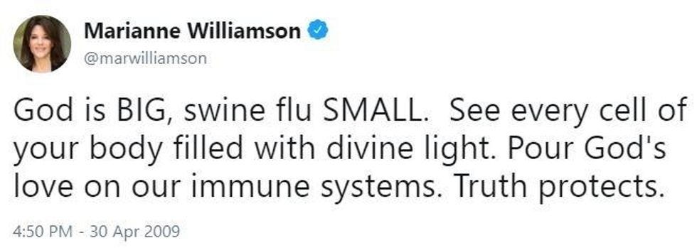 It could be any of those things! But probably it is a nefarious plot to make people not take her seriously as a candidate for President of the United States, a thing that people would definitely do otherwise. I mean, if I hadn't been sent that memo from an unknown email address instructing me to say that Marianne Williamson is a kook, this article would probably be about how super normal it is that she thinks AIDS can be cured with prayers.