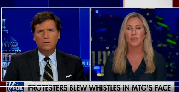 For the nine seconds Greene was in New York, the people there — real Americans — heckled her and chased her with sticks. (OK not with sticks. That would have been funny.) They blew whistles very loudly, but that was people on her own side, because some MAGA moron was giving out whistles.