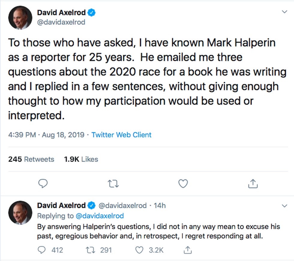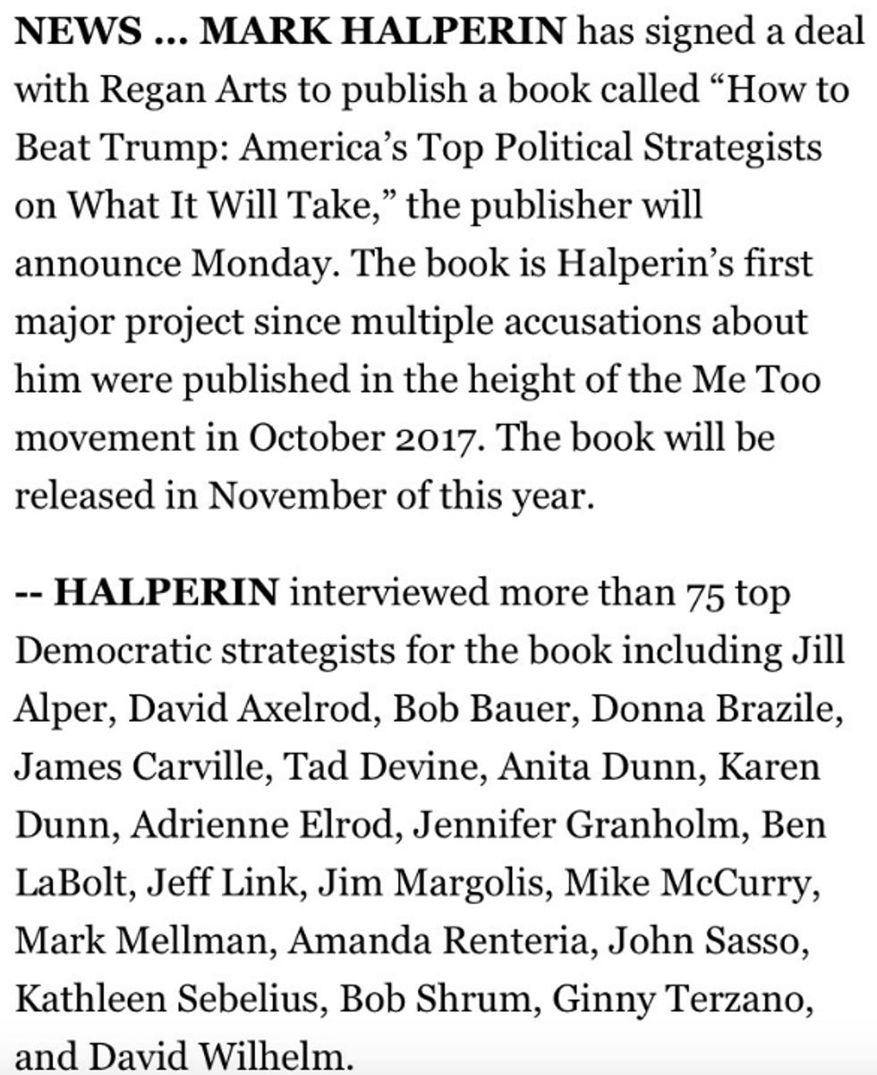 Halperin's upcoming book is How to Beat Trump: America's Top Political Strategists on What It Will Take . Halperin spent most of the 2016 campaign normalizing Donald Trump and now he wants to cash in on the desperate efforts to remove him. Trump has been credibly accused of sexual assault by enough women to form a small town. Regan Arts presumably thinks it takes a predator to catch one. We have an unsolicited clue for the "75 top Democratic strategists" who spoke with Halperin: If you want to beat Trump-ism, you can start by refusing to enable the institutional misogyny that lets men abuse women and then resume their lucrative careers after a brief time out.