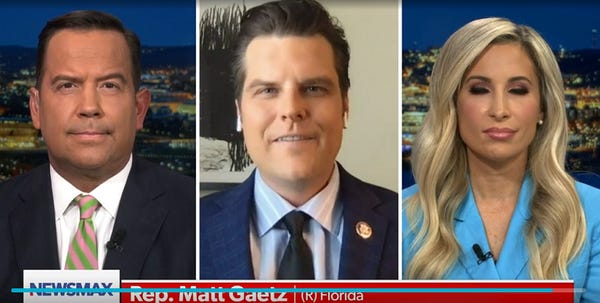 World's most attractive US American Republican congressman Matt Gaetz (pictured above, attractively) went on Newsmax recently to whine about how the FBI loves it when people snitch to them, and how that is just like the Soviet Union. That's it, that's the joke, that's the whole post, everybody.