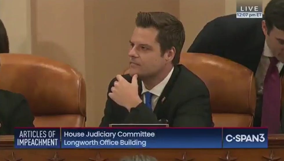 Florida Rep. Matt Gaetz (R-I'm Fine, Ossifer) gave us a good case study in this today during the impeachment markup hearing in the House Judiciary Committee. Desperate to make the hearing about (debunked) allegations of nefarious Biden activity in Ukraine, and NOT Trump's attempted election-stealing crimes, Gaetz thought it would be good to talk about Hunter Biden's substance abuse issues and DUI.