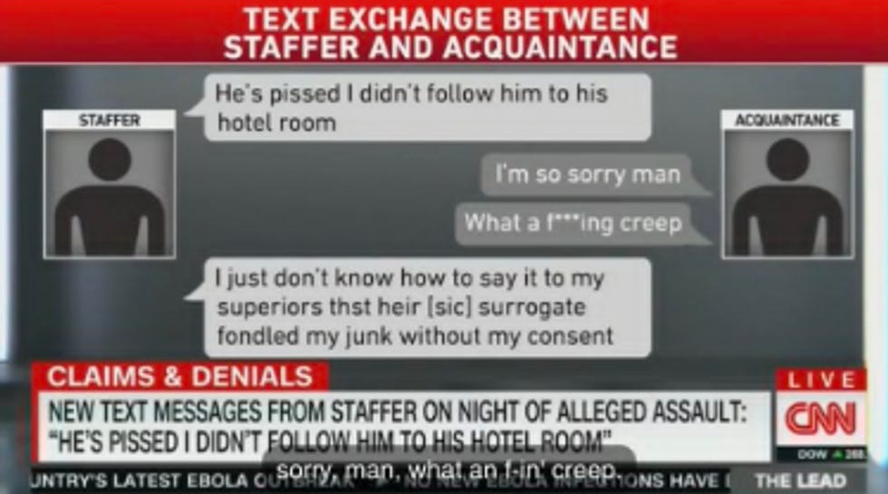 The staffer later texted, “I just don’t know how to say it to my superiors thst heir [sic] surrogate fondled my junk without my consent.”
