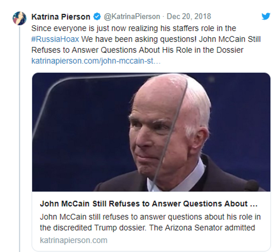 Maybe there is a solution to tweeting shit that makes you look so very very dumb, Pierson: stop tweeting altogether . Because space bars and enter keys are required, you've obviously not managed to master using them, and Dead Senators don't give a fuck about your questions. Leave John McCain alone, please, there is no point bringing him up. Just look cute and support Trump, honey. Be quiet.