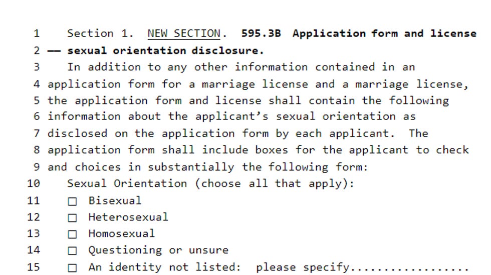 Now before you say something like "What in the fuck" or "We sure are glad Iowa doesn't have any other problems if they're worried about this," you should look at the text of the bill so you can make fun of it even more: