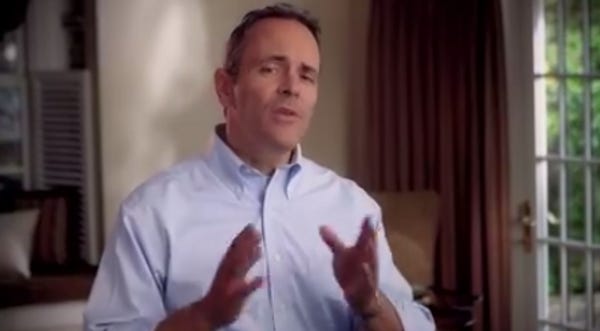 We first met the millionaire tea party darling in the summer of aught 13, when he caused the various teabagger splitters to quarrel amongst themselves about whether they were or were not Standing With Mitch. We soon learned that what little we knew about Bevin probably wasn't true anyway, since he apparently inflated his LinkedIn profile with extras like "graduated from MIT." (He did not graduate from MIT.)
