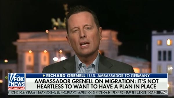 Grenell told Breitbart not long after he got to Germany that he really wanted to stand with the "conservatives" of Europe, as if we don't know what "conservatives" means in the context of Europe's little problem with Nazis and anti-immigrant extremists. He just loves the right-wing Nazi-lite government of Austria, as you can see in this very ambassador-y appearance on Tucker Carlson's White Power Hour, where he actually seemed to hint that Germany needed new leaders: