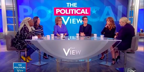 Rachel Maddow appeared on "The View" yesterday to promote her new book Blowout. It probably wasn't her idea. Someone just showed her the royalty potential. Naturally, the dueling banjos of daytime conservative thought, Meghan McCain and Abby Huntsman, tried to come for her. It was the battle of nitwit stars versus a thinking person.