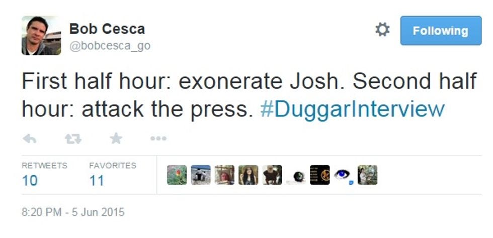 9: The revelation of Josh Duggar's actions will hurt other victims:This is a weird one: Jill explains that the news about the Duggar family will actually scare abuse victims away from coming forward, because of all the negative publicity her family has gotten. We feel fairly comfortable predicting that since most abuse victims don't have top-rated reality shows, this one may be a stretch. Nevertheless, Megyn Kelly closed the show with an appeal for victims of abuse to call a hotline, even if they don't have a TV show.