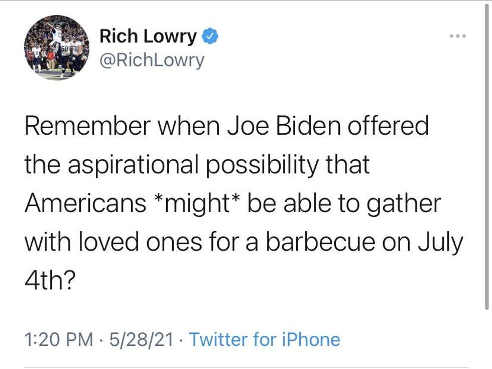 During a speech in March in recognition of the pandemic's first anniversary (traditionally commemorated with paper), President Joe Biden suggested that if we all do our part together, as a nation, we might be able to safely gather outside with our loved ones and even our family members for a Fourth of July cookout or barbecue. National Review editor Rick Lowry couldn't resist gloating over how Uncle Joe had failed the country by delivering on his promise a month early. Maybe Lowry is the one who's old and confused.