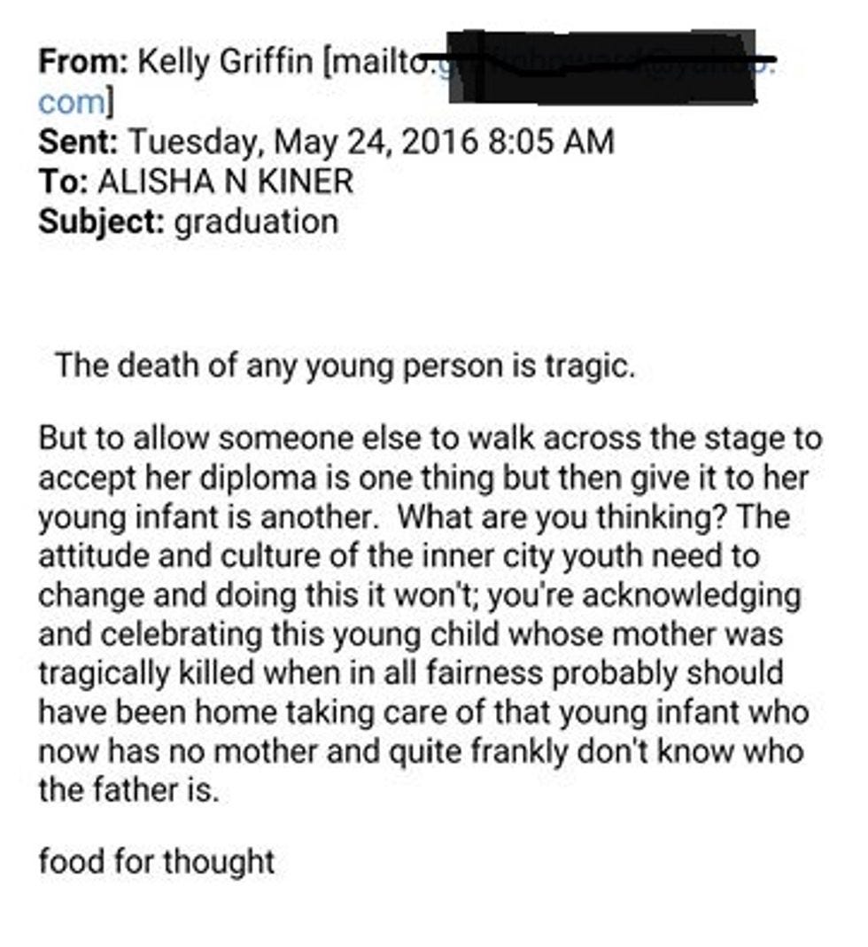 Well! As we said, Myneishia was set to graduate this weekend from Booker T. Washington High School. It's now been announced that her one-year-old son, Kylen, will walk to receive his mom's diploma in her place, and would you believe a Concerned Citizen White Guy is just appalled by the message this sends to Our Inner City Youth? (Read: Not his inner city youth, except for when he is sticking his dumbass nose in with his opinion.)