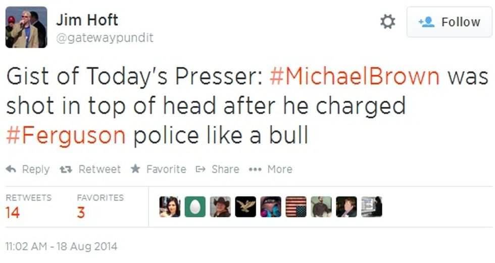It sure is a relief to know that Jim Hoft, Medical Examiner, is on the case. There is only one possible interpretation of a gunshot to the top of the head, and that is charging like a bull, wearing flip-flops, after having taken five other gunshots. Hoft also posted a clever headline saying "Autopsy SHOOTS HOLES in Eyewitness Testimony: Victim Michael Brown WAS NOT Shot in Back," although as Professor Parcells noted, one of the wounds to Brown's arm may have been consistent with eyewitness testimony that Brown suddenly jerked around at one of the shots -- and since arms are moveable, his arm could have been in several different positions. So no, the eyewitness testimony has not been left lying in the street in a pool of blood, either.