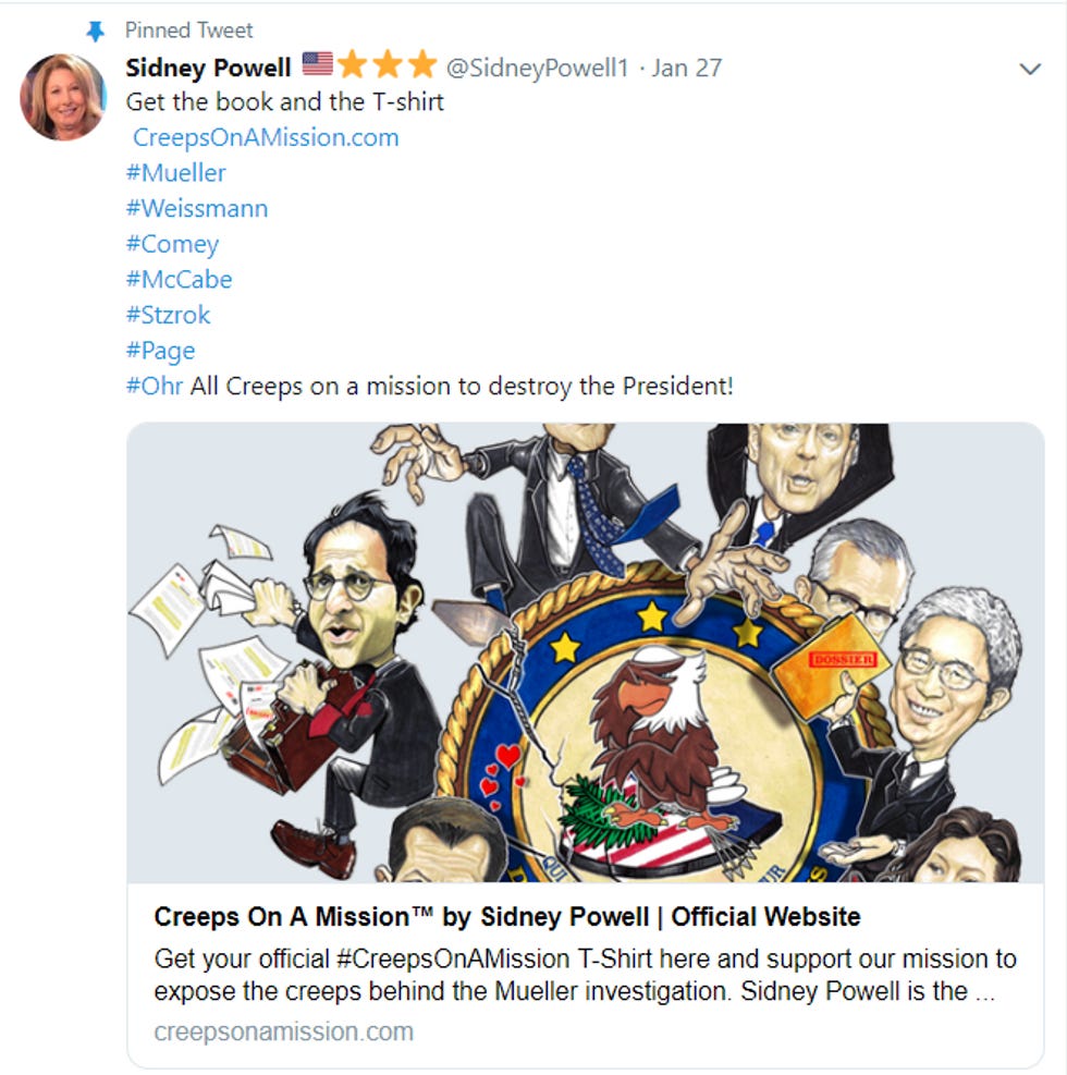Powell's Twitter is a hoot. She RTs people like Michael Flynn's batshit brother and Jack Posobiec, and tags congressmen who sue imaginary internet cows for hurting their feelings.