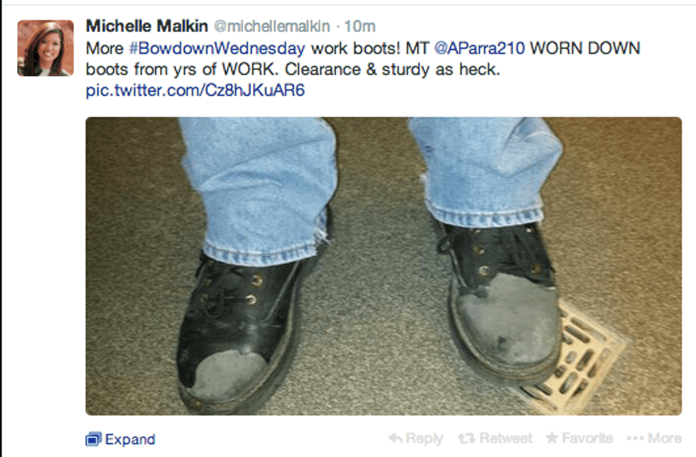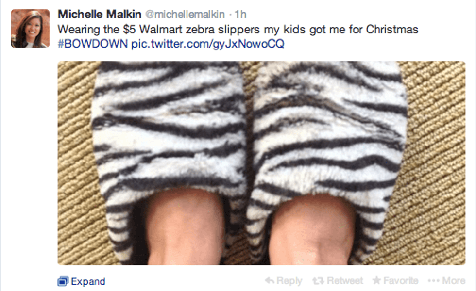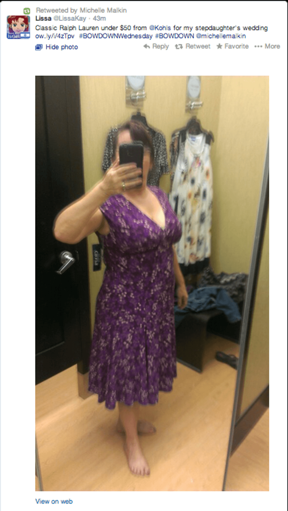 Well, some "journalist" (haw haw haw scarequotes) from NBC tweeted #BOWDOWN (it is, we are informed, a #Beyonce thing) with a picture of this dress, and the nine fulltime staffers at Twitchy had themselves a motherfucking cow babby, right there in their jammies. (It was very messy. Just cow babby placenta goop EVERYWHERE.) Now, Michelle Malkin is retweeting pictures her followers sent her of their best Goodwill finery. Let us see, with a lazy, Twitchy-style bunch of other people's tweets, what Michelle Malkin's Flying Monkeys think the First Lady of the United States should wear to a State Dinner, after the jump!