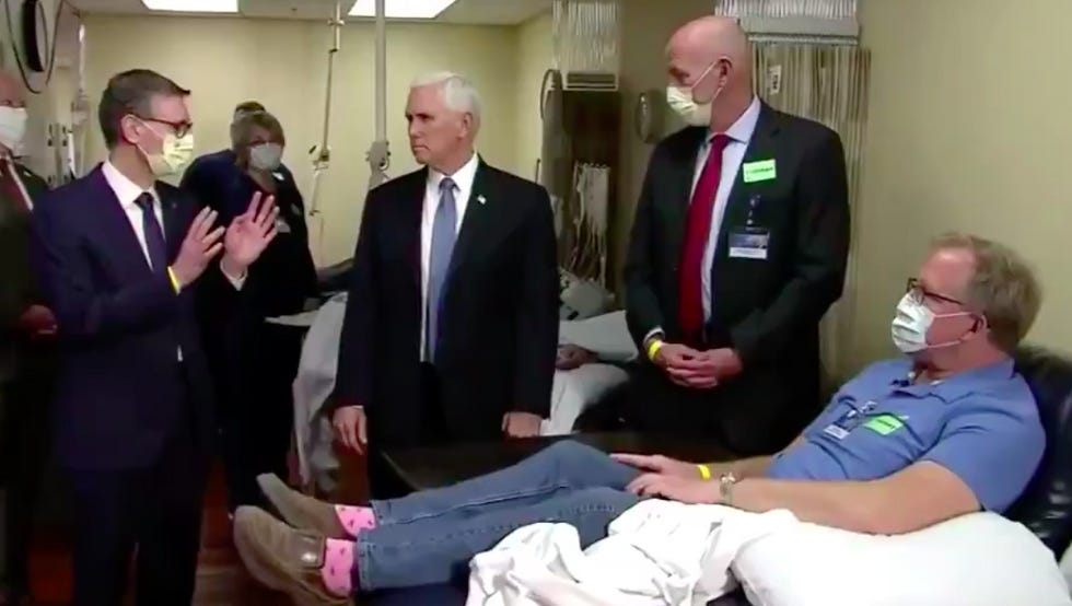But they probably didn't mean the guy second in line to the presidency. And certainly not when he has to appear on camera! You couldn't possibly expect a VIP like Mike Pence to wear a mask on television during a pandemic. It might scare people. Or worse yet, muss his hair!