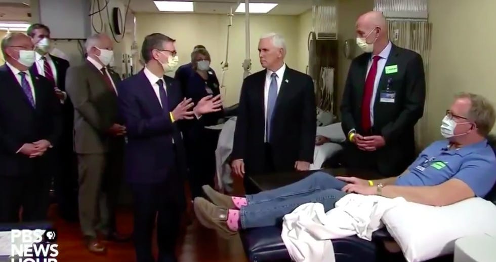 UPDATE: The Veep has issued a statement saying that, as he and all his staff are "tested for the coronavirus on a regular basis," he opted to go maskless out of GRATITUDE to the hospital staff. Take that, haters!