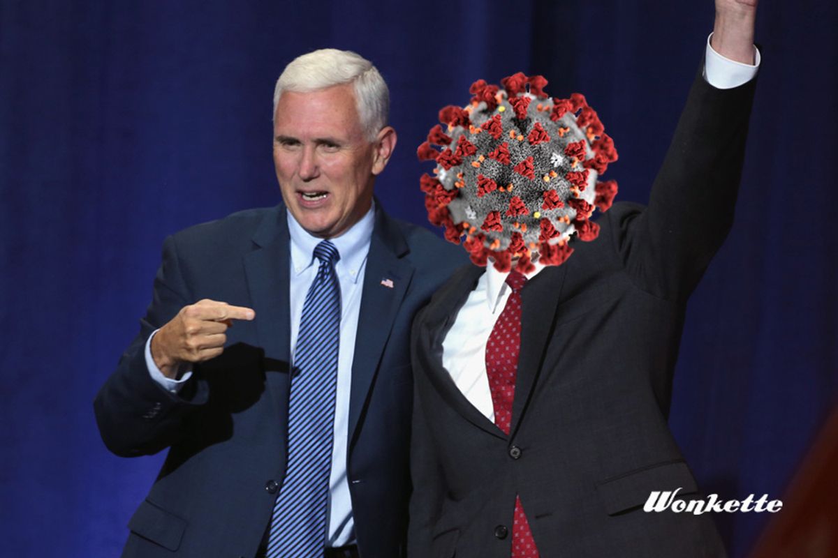 There were two big takeaways from Donald Trump's big coronavirus presser last night. One that the scientists know what they're doing, and they're concerned, but Donald Trump wants you to look on the bright side and share his assumption that everything's gonna be just fine. The other is that Trump has handed the job of coordinating the government's response to Vice President Mike Pence -- apparently without informing HHS Secretary Alex Azar beforehand! -- and that should really make all of us worry more than a little bit, given Pence's shitty record on public health.