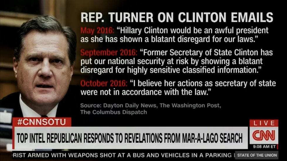 Last week, Donald Trump's rich asshole truck stop Mar-A-Lago wasraided legally searched by the FBI . Since then, every Republican politician has raced to the nearest mic or camera to caterwaul about how unfair it is to treat Trump as if no one is above the law. A perfect example of this is Republican congressman Mike Turner of Ohio, the ranking member of the House Intelligence Committee, whose arguments about this have been aging like a glass of milk in the sun.