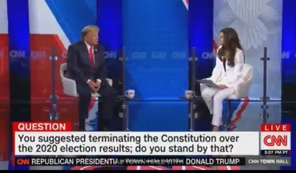 Collins asked him about his call to terminate the Constitution, and he lied and claimed he said no such thing (he did). Collins didn't challenge him further. He got another round of applause when he said Mike Pence should’ve helped him steal the election, so that was scary. The audience also laughed when Trump grossly smeared E. Jean Carroll, a woman he sexually abused. He later called Collins a “nasty person” (a more gender-inclusive version of his “nasty woman” dig) and the audience roared. It’s like when they put a laugh track over a horror movie.