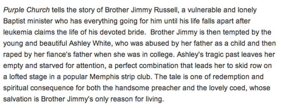 Oh good. Baptist minister is lonely because wife died, so he finds sex abuse victim and known hottie Ashley White at a Memphis strip club, and they are both redeemed, but not before some good old Memphis FUCKIN'. Do they get redeemed, though, for reals? Dark Horse Mississippi says no: