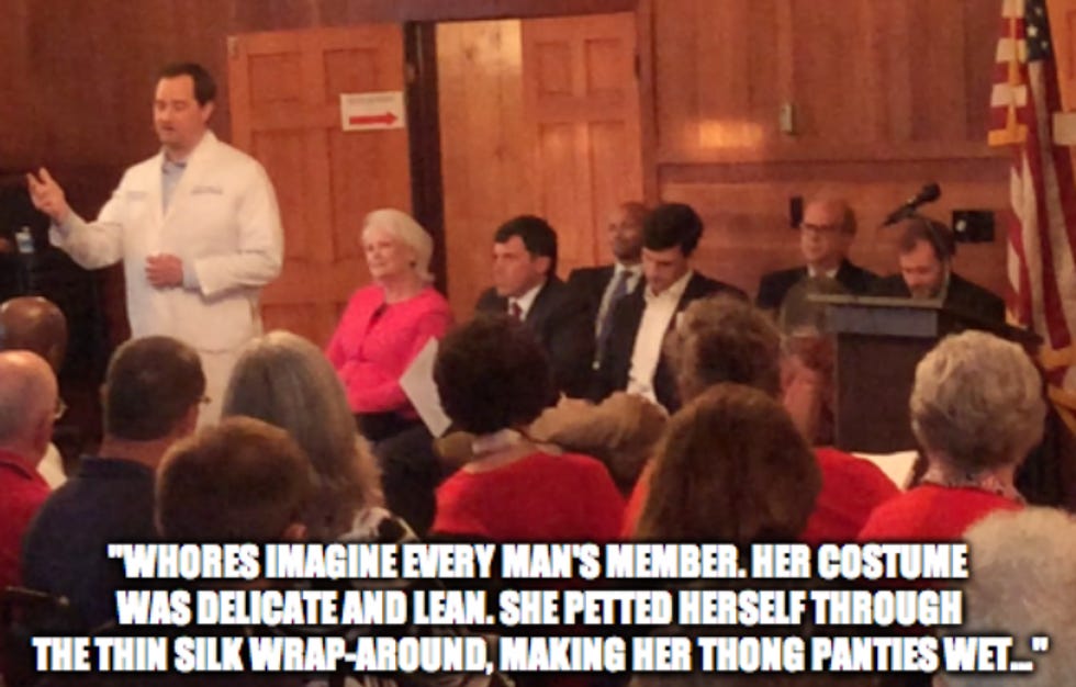 A teabagger who seems sociopathic and has issues relating to women? YOU DON'T SAY. So, for funsies, our new favorite Mississippi blogger decided to take some of the best quotes from the book and make them into memes, illustrated by pictures of Dr. Starner Jones at a town hall meeting in Pontotoc, Mississippi. Forthwith, our favorites, and if you want to read them all, then click over to that blog!