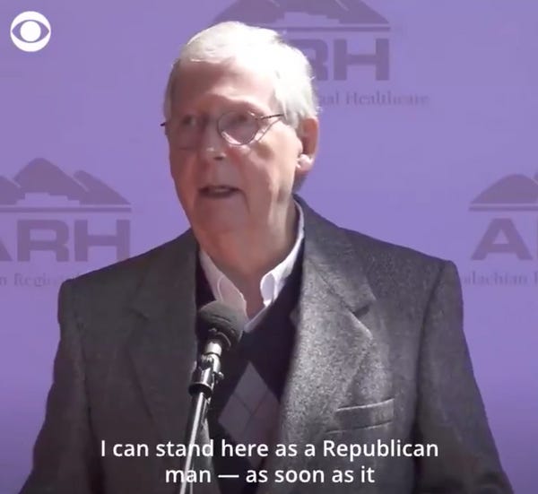 MCCONNELL: I can stand here as a Republican man, as soon as it was my turn, I took the vaccine. I would encourage all Republican men to do that. There are some other segments that have some reservations, but with regard to Republican men, take the vaccination. Two of 'em are 90 percent effective. One of 'em is 70 percent effective, and I didn't realize until this pandemic began that the flu shot is only 50 percent effective, and a whole lot of people get the flu shot.