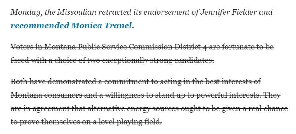 So the paper reversed itself Monday and endorsed Monica Tranel, the Democrat in the race. The original endorsement is still online, but with every word struck through and a link to the new endorsement.