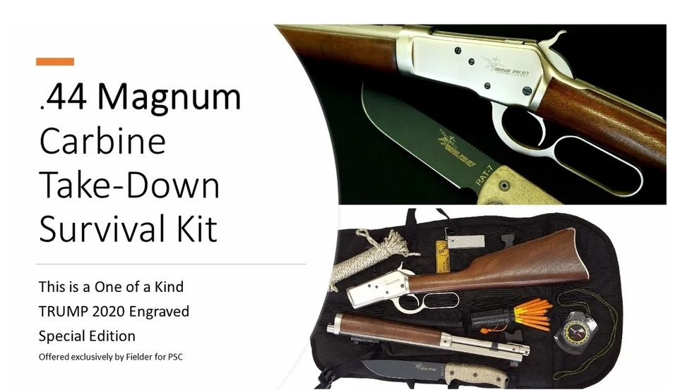 an 1892 Winchester clone .44 Magnum take-down carbine lever gun (8 + 1 capacity) with Skinner Sights. The "take-down" (2-piece) firearm can be carried in a compact case and easily assembled in seconds. No tools required! Plus, it's an engraved TRUMP 2020 special edition with a matching RAT 7 knife, AND the kit also includes a compass, mil spec cord, and emergency tube shelter, pocket stove with fuel cells, magnesium striker, and storm-proof flare matches. All items fit snugly into a durable 22" compact carrying case (included)! Firearm made in Italy. Sights and all other items made in the USA.
