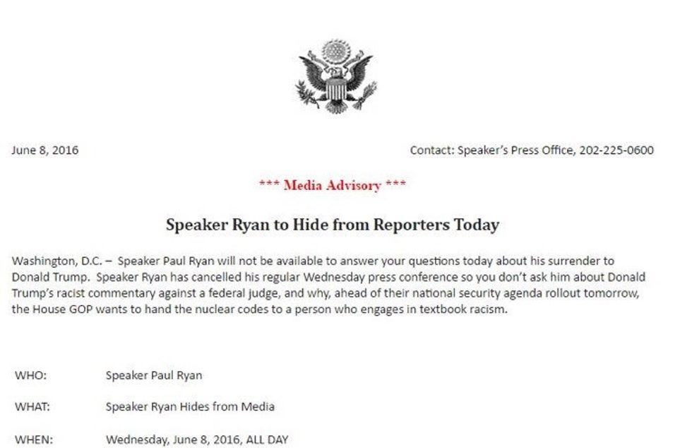 Washington, D.C. -- Speaker Paul Ryan will not be available to answer your questions today about his surrender to Donald Trump. Speaker Ryan has cancelled his regular Wednesday press conference so you don't ask him about Donald Trump's racist commentary against a federal judge, and why, ahead of their national security agenda rollout tomorrow, the House GOP wants to hand the nuclear codes to a person who engages in textbook racism.