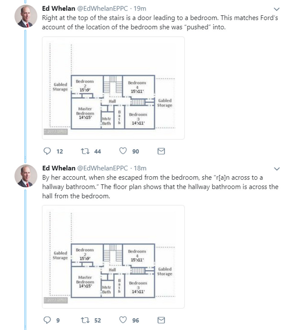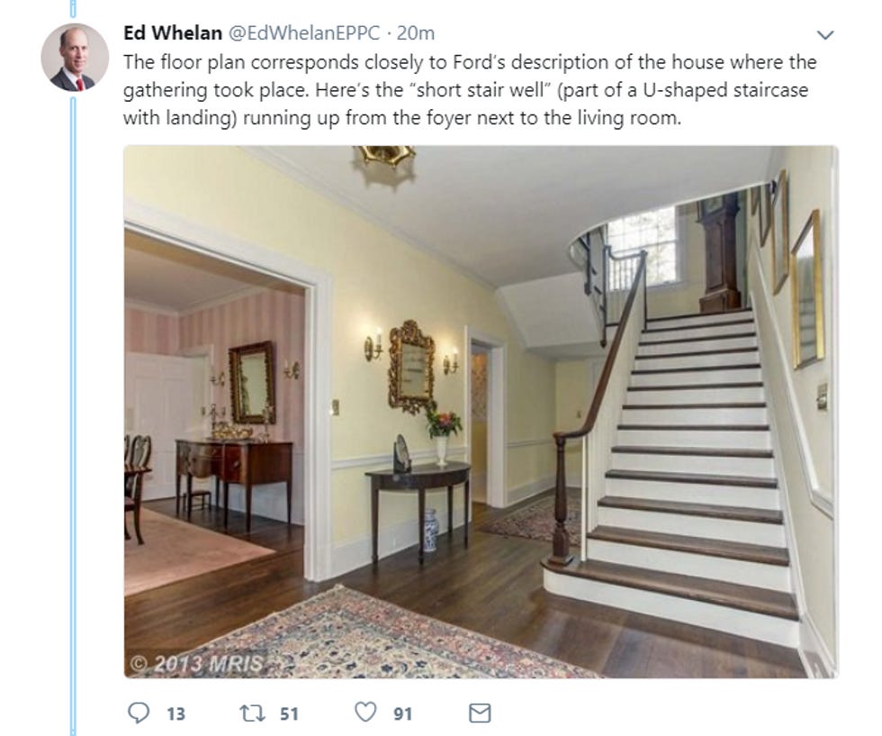 Ed Whelan, architectural analyst, noted that at the top of the stairs there was a bedroom, which is super weird design, except for how it features in pretty much every traditional two-story house in the United States of America. Not only that, but there was a bathroom in that hallway! And Christine Blasey Ford said she hid in a bathroom across the hall! What kind of a house has bathrooms upstairs by the bedrooms????
