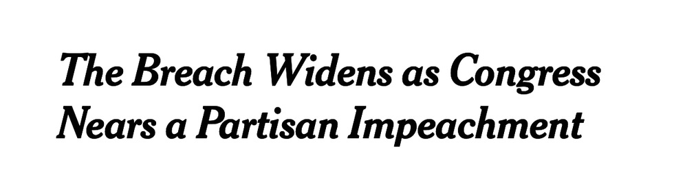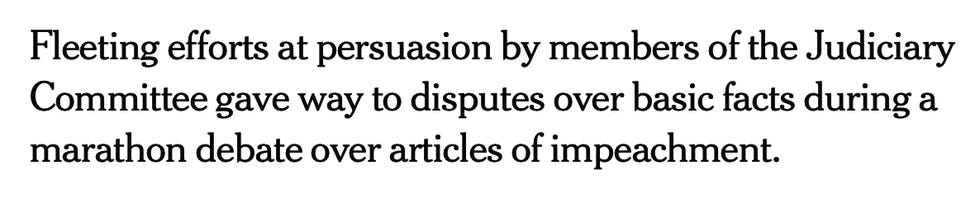 Republicans are disagreeing with witnesses, evidence, and reality itself. Yet the Times just lamented that "the appeals to rise above the tribalism of the moment" failed. Republicans want to spin impeachment as a partisan spectacle, and the Times is more than willing to help. Democrats want to present impeachment as a sober exercise of their oaths of office, and the Times just reports how they've failed.