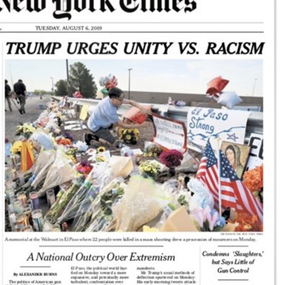 The second print edition went out with the far less ambiguous "ASSAILING HATE, BUT NOT GUNS," and even the hed of the secondary story suggested Trump's speech might not have been an outpouring from his broken heart.