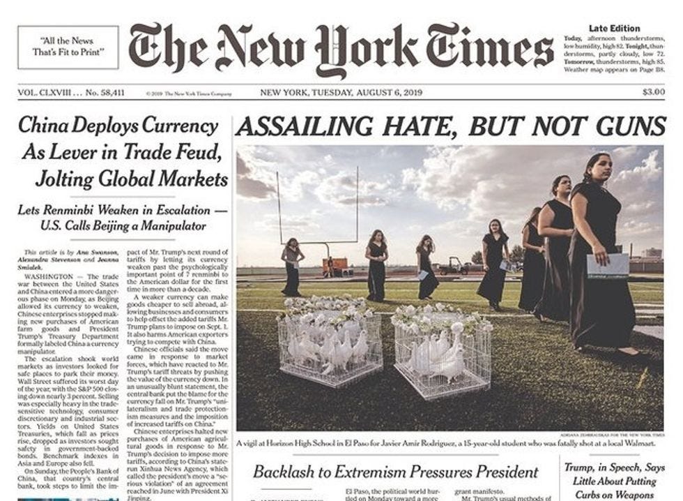 The New York Times ran an appropriately sober editorial Sunday, by the whole Editorial Board, condemning white nationalist terrorism and the sorry state of our great nation, and calling on law enforcement and political leaders to do more to fight the hateful ideology. It was a New York Times editorial, as starchy and uprighteous as you'd expect, and starts off by pointing out that if the two mass shootings over the weekend had been perpetrated by Islamic radicals, we'd already be well into a full mobilization of government to fight the jihadists, complete with equivocal regard for civil rights when it came to mosques and online forums.