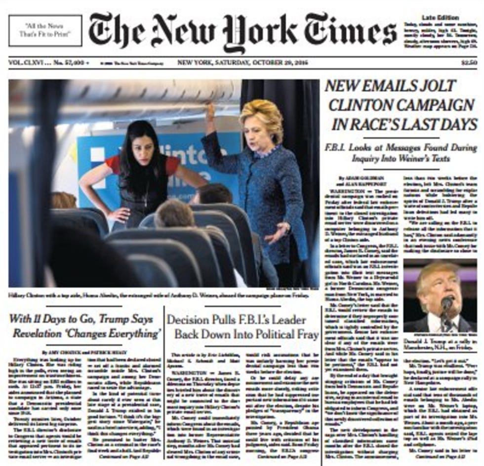 Haberman's paper was uniquely guilty in its obsession with BUT HER EMAILS!!!! from the very beginning, and it was harping on it long after James Comey cleared Hillary Clinton of all charges of wrongdoing last summer. When Comey decided ELEVEN DAYS BEFORE THE ELECTION to jam the email investigation back into the news ... well, you see the NYT front page Nate Silver tweeted above. Wanna see it again?
