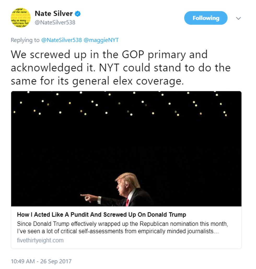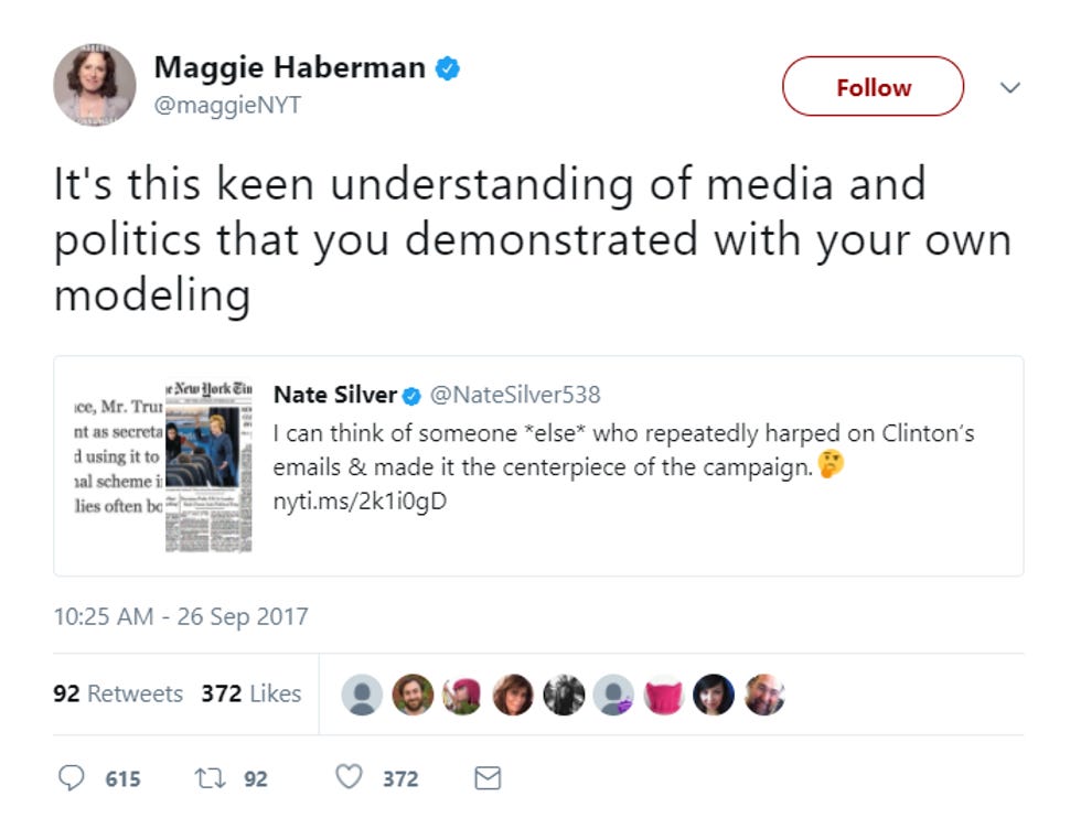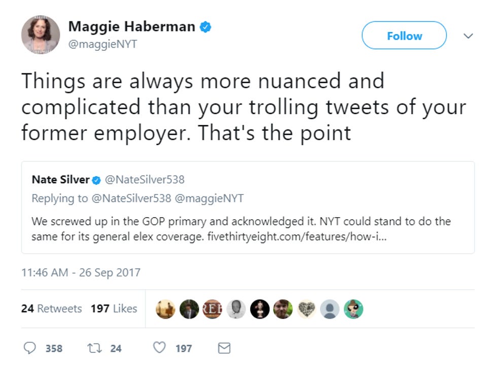 Well that's just far too reasonable, Nate Silver! Why should the New York Times , the finest news institution that ever did exist, have to do any self-examination? Shouldn't it just be allowed to keep fucking up and then halfway saying sorry days/weeks/months/years after the fact? Maggie Haberman will not let such injustice stand, so she decided to be a dick again:
