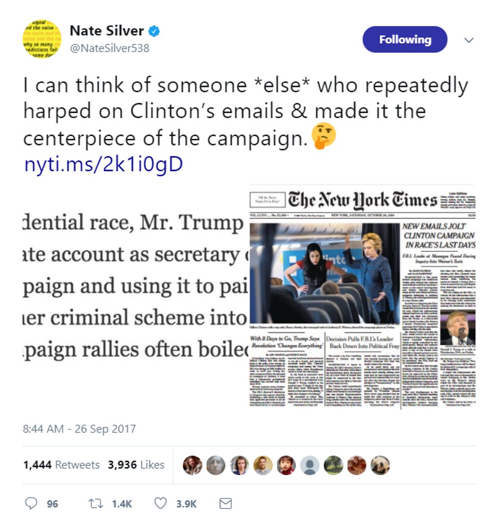 That's very true! Donald Trump did "repeatedly harp" on Monster Villain Hillary, who directed the Benghazi attacks gleefully from behind her AOL account. But Trump wasn't the only one "harping," as we recall! Pollster person Nate Silver also recalls somebody else who harped on Hillary's emails ad nauseam , long after the issue was over, in a feeble, "both sides do it" attempt to cover the election "fairly," because they are "expert journalists" who went to "school" to get "good" at "journalism":